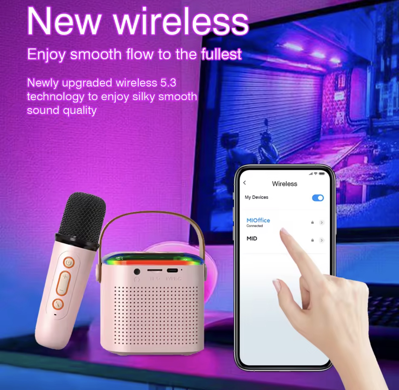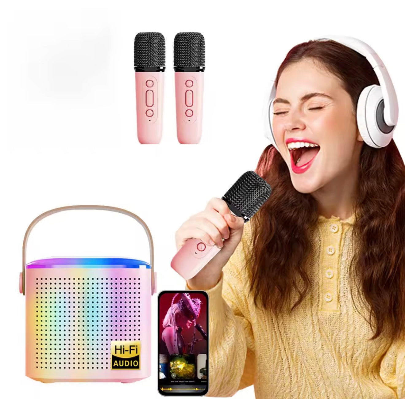 Portable wireless karaoke speaker with RGB lights, two microphones, and a long-lasting rechargeable battery. Perfect for family karaoke, parties, and birthday celebrations. Enjoy powerful sound, fun lighting effects, and easy Bluetooth/USB/AUX connectivity.